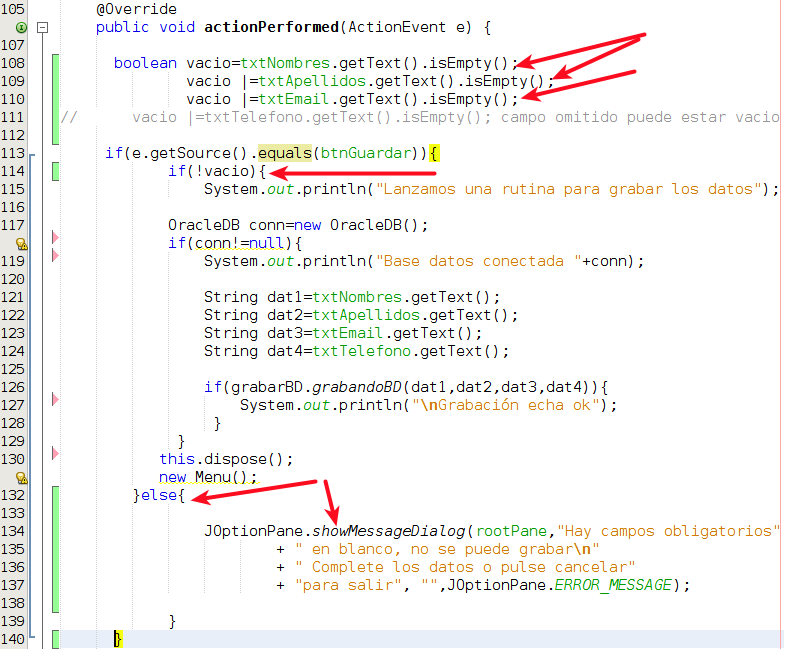 Vamos a ver el código que hay que añadir en el método actionPerformed(), y en el if que captura si el botón guardar fue pulsado, que es el siguiente: